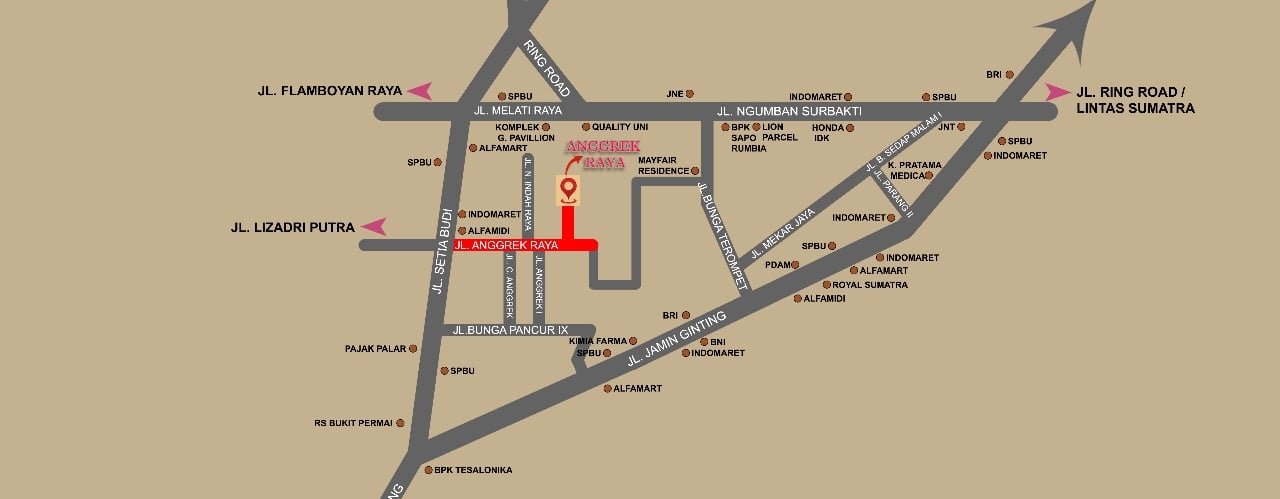 Anggrek Suite berada di kawasan strategis Setiabudi Ujung Medan, mudah dijangkau dan dekat dengan fasilitas penting. Seperti kampus USU, UNIKA, Rumah Sakit Adam Malik, Pasar Induk Laucih serta Kawasan Bisnis dan Kuliner Ringroad.